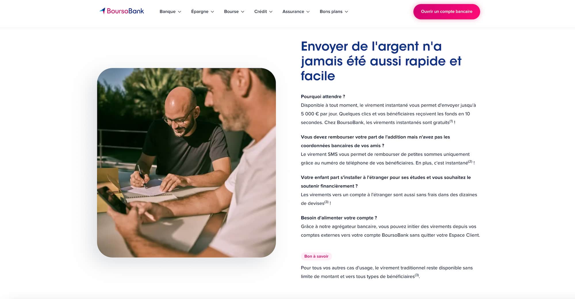 👉 Chez Boursobank, l’envoi d’un virement par SMS et la réception sont 100% gratuits. Le montant maximal par opération est fixé à 100€ et limité à 500€ sur une période de 30 jours glissants. Si le destinataire détient un compte BoursoBank, son compte sera alimenté sous 10 secondes. S’il est client d’un autre établissement acceptant les virements instantanés, il devra renseigner lui-même son IBAN en cliquant sur le lien reçu par SMS puis recevra les fonds sous 10 secondes.