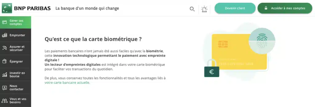 - ✔️Carte biométrique disponible chez BNP Paribas : BNP Paribas est actuellement la seule banque à proposer une solution de paiement biométrique en France. La cb biométrique est proposée en option avec la carte haut de gamme Visa Premier